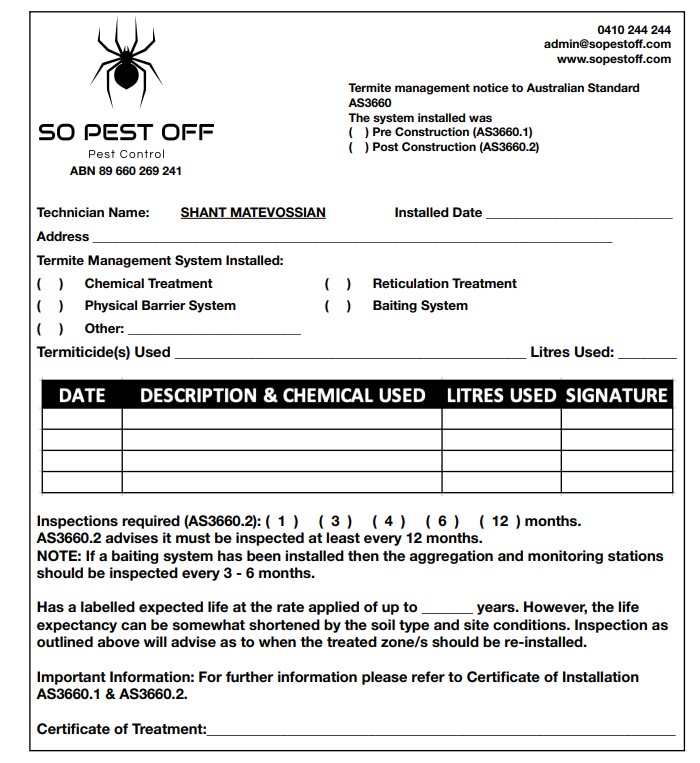 You should possess a termite management certificate, a durable notice (often found inside the meter box), and documentation from the builder or pest control company. These documents will detail the type of system installed, the installation date, and the maintenance schedule, ensuring you are informed about your property’s protections.